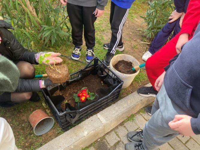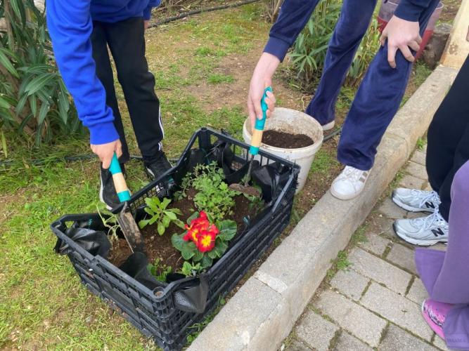 Με ιδιαίτερο ενθουσιασμό, οι μαθητές μας φύτεψαν λουλούδια, λαχανικά και μυρωδικά, τα οποία προσφέρθηκαν από το φυτώριο του Δήμου μας αλλά και από τις οικογένειες των παιδιών. Αρχικά, τα φυτέψαμε σε τελάρα, χρησιμοποιώντας το δικό μας κομπόστ για να ενισχύσουμε το χώμα με φυσικό και οικολογικό τρόπο. Στη συνέχεια, μόλις τα φυτά μας δυναμώσουν, θα μεταφυτευτούν στον σχολικό μας κήπο, όπου θα συνεχίσουν να μεγαλώνουν και να ομορφαίνουν τον χώρο μας.
