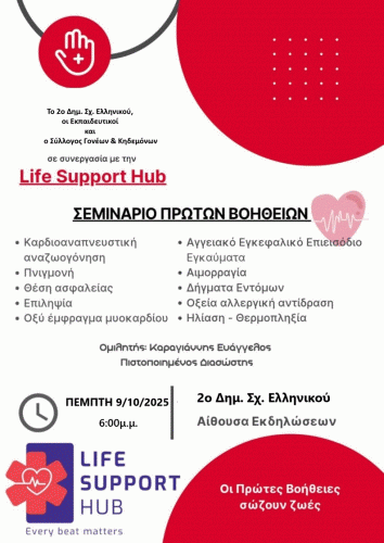 Το 2ο Δημοτικό Σχολείου Ελληνικού, οι Εκπαιδευτικοί και ο Σύλλογος Γονέων και Κηδεμόνων σε συνεραγσία με την Life Support Hub σας προσκαλούν στο Σεμινάριο Πρώτων Βοηθειών που θα πραγματοποιηθεί στην Αίθουσα εκδηλώσεων, την Πέμπτη 9/10/2025 στις 6μμ.