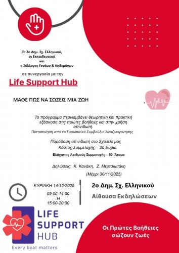 Το 2ο Δημοτικό Σχολείο Ελληνικού, σε συνεργασία με το LifeSupportHub.edu διοργανώνει για ακόμη μια φορά σεμινάριο Πρώτων Βοηθειών, αυτή τη φορά για πιστοποιηση. Με την συμμετοχή σας, όχι μόνο γίνεστε ένας πιστοποιημένος ανανήπτης, αλλά συμβάλετε στη σημαντική προσπάθεια από το σχολείο μας, με τα χρήματα συμμετοχής να αγοραστεί και να τοποθετηθεί απινιδωτής από τη συγκεκριμένη ομάδα, όπως και να εκπαιδευτούν οι συμμετέχοντες στη χρήση του.